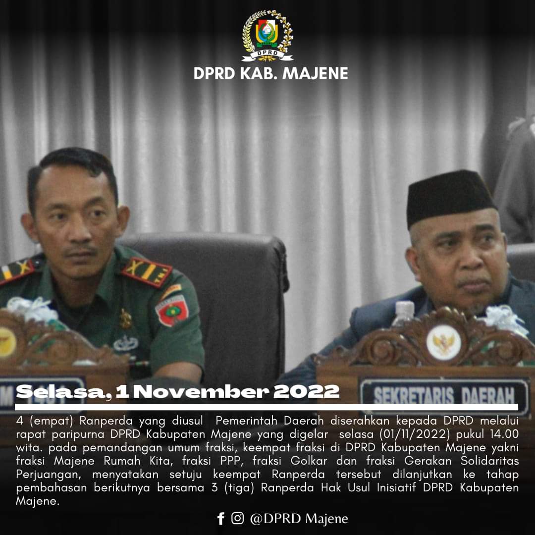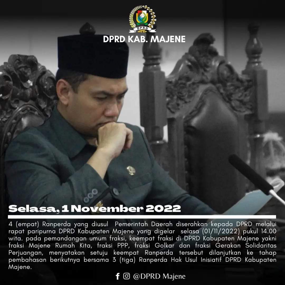 Empat Ranperda yang diusul Pemerintah Daerah (Pemda) diserahkan Wakil Bupati Arismunandar kepada Ketua DPRD Salmawati Djamado melalui rapat Paripurna DPRD Kabupaten Majene yang digelar Selasa (01/11/2022) pukul 14.00 Wita. Pada pemandangan umum fraksi keempat fraksi di DPRD Majene yakni Fraksi Majene Rumah Kita, Fraksi PPP, Fraksi Golkar dan Fraksi Gerakan Solidaritas Perjuangan (GSP) menyatakan setuju keempat Ranperda tersebut dilanjutkan ke tahap pembahasan berikutnya bersama tiga Ranperda Hak Usul Inisiatif DPRD Kabupaten Majene.(ADVTORIAL)