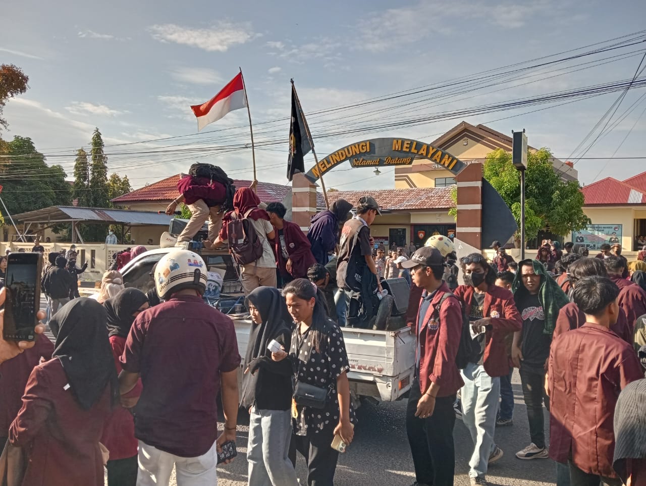 Pantauan terassulbar.id, para mahasiswa mengenakan jas almamater berwarna merah maron sambil membawa bendera Merah Putih serta sejumlah atribut aksi. Sebuah mobil pick-up putih yang dilengkapi pengeras suara turut digunakan, dengan lagu bertema kritik sosial mengiringi jalannya unjuk rasa.