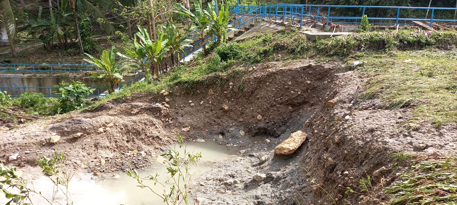 Sementara itu bagian sisi kiri juga terlihat ada lubang besar yang diakibatkan gerusan air yang berasal dari bendungan yang tak mampu lagi menampung debit air yang meluap akibat air hujan deras.