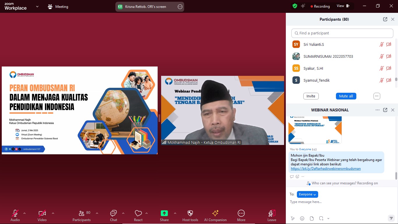 Kepala Perwakilan Ombudsman RI Sulbar, Fajar Sidiq, dalam sambutannya menekankan pentingnya tema webinar tersebut. “Dalam kehidupan sehari-hari, kita dihadapkan pada derasnya arus informasi di media sosial, grup WhatsApp, dan platform digital lainnya. Informasi yang seringkali simpang siur ini menimbulkan kebingungan dan kecemasan, misalnya orang tua yang khawatir anaknya terpapar informasi kesehatan yang keliru, atau guru yang kesulitan menghadapi murid yang lebih percaya pada informasi TikTok daripada buku pelajaran,” ujar Fajar.
