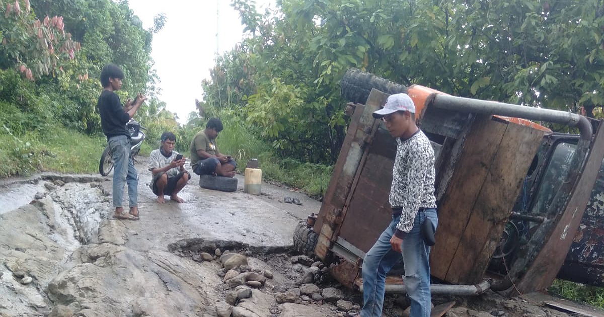 Keterangan dari supir, Tison , dirinya tidak bisa mengendalikan kemudi akibat jalan yang rusak parah.
