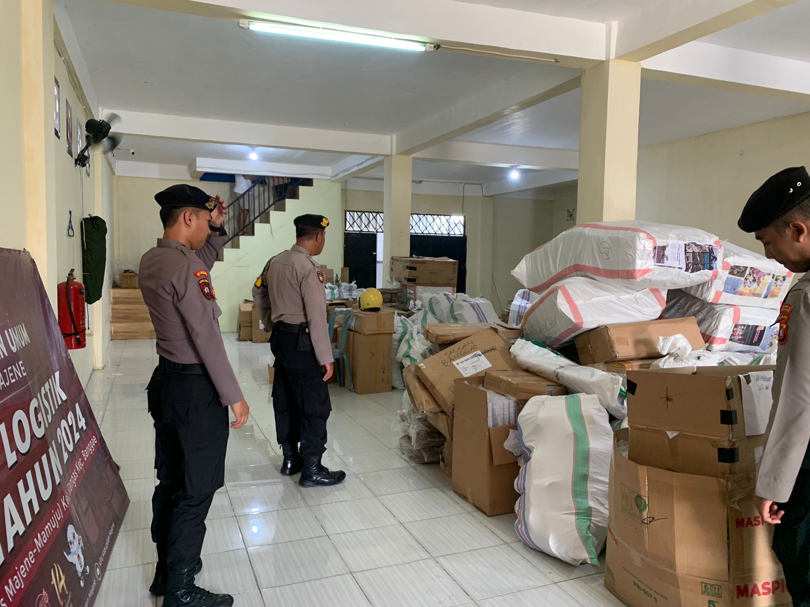 Majene,terassulbar.id-Polres Majene Memberikan jaminan kelancaran dan keamanan Pemilihan Umum (Pemilu) 2024, Satuan Tugas (Satgas) Preventif Operasi Mantap Brata Polres Majene melaksanakan pengamanan di gudang Logistik Komisi Pemilihan Umum (KPU) Majene. Senin (29/1/24)