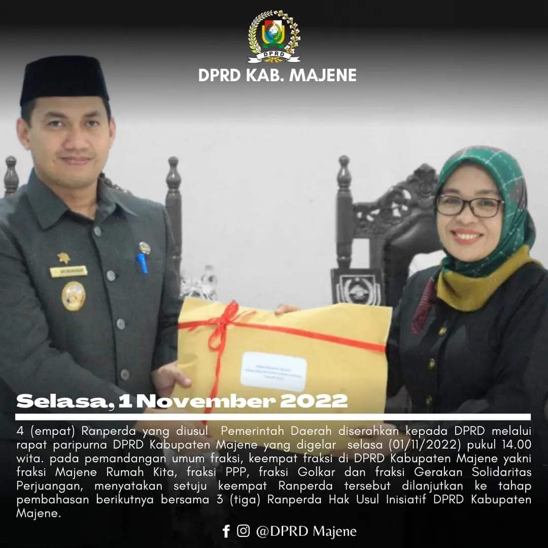 Empat Ranperda yang diusul Pemerintah Daerah (Pemda) diserahkan Wakil Bupati Arismunandar kepada Ketua DPRD Salmawati Djamado melalui rapat Paripurna DPRD Kabupaten Majene yang digelar Selasa (01/11/2022) pukul 14.00 Wita. Pada pemandangan umum fraksi keempat fraksi di DPRD Majene yakni Fraksi Majene Rumah Kita, Fraksi PPP, Fraksi Golkar dan Fraksi Gerakan Solidaritas Perjuangan (GSP) menyatakan setuju keempat Ranperda tersebut dilanjutkan ke tahap pembahasan berikutnya bersama tiga Ranperda Hak Usul Inisiatif DPRD Kabupaten Majene.