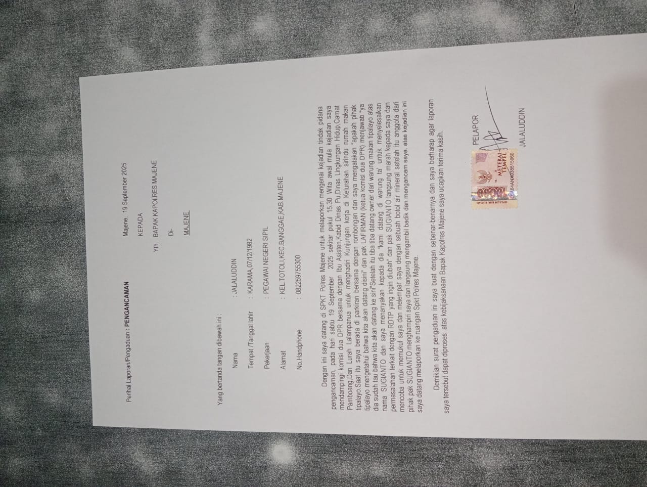 Dalam laporan pengaduan yang ditujukan kepada Kapolres Majene, Jalaluddin menjelaskan bahwa dirinya menerima ancaman dari seseorang yang membuat dirinya merasa tidak aman dan tertekan dalam menjalankan tugas sebagai lurah.