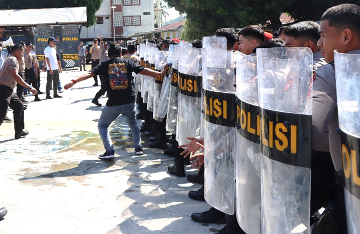 Dalam Latihan simulasi ini, personel kepolisian diperlihatkan langkah-langkah yang harus diambil, mulai dari negosiasi hingga penggunaan kekuatan sesuai dengan prosedur yang berlaku untuk mengendalikan situasi.