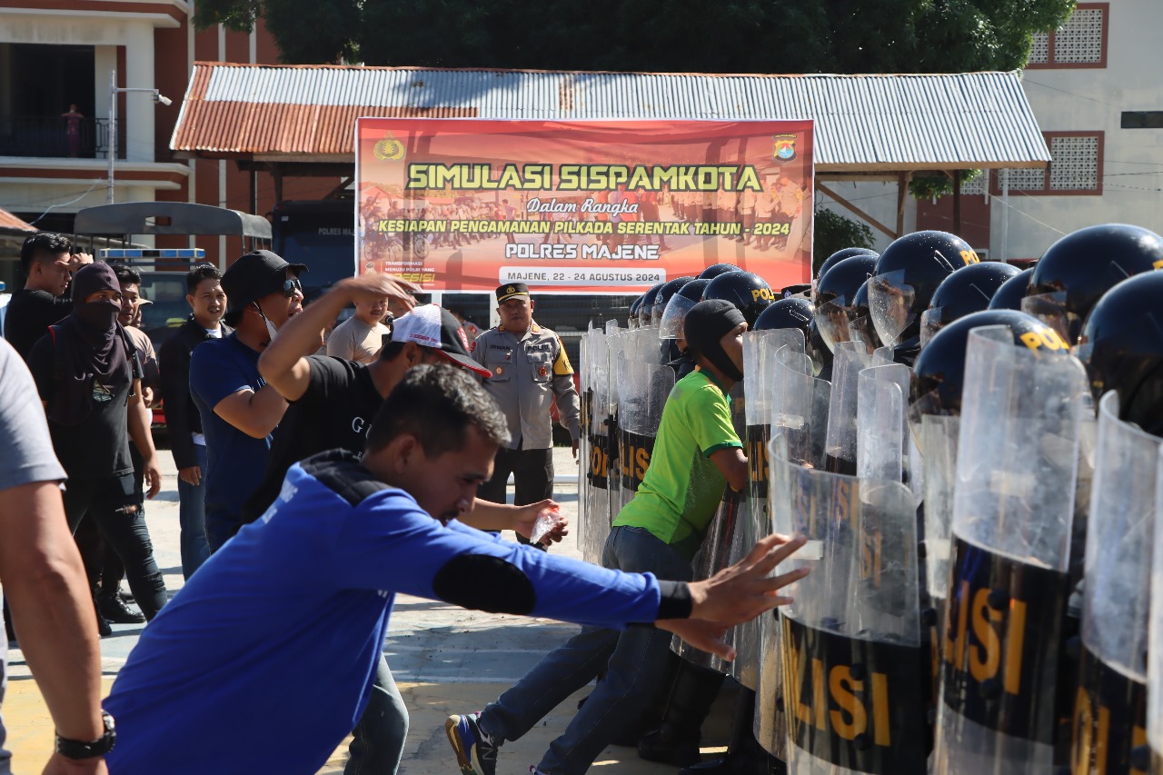 Simulasi SISPAMKOTA yang digelar pada Senin (26/8/24) dilapangan Mapolres Majene ini menggambarkan berbagai skenario yang mungkin terjadi selama Pilkada, termasuk skenario untuk menghalau massa yang anarkis.