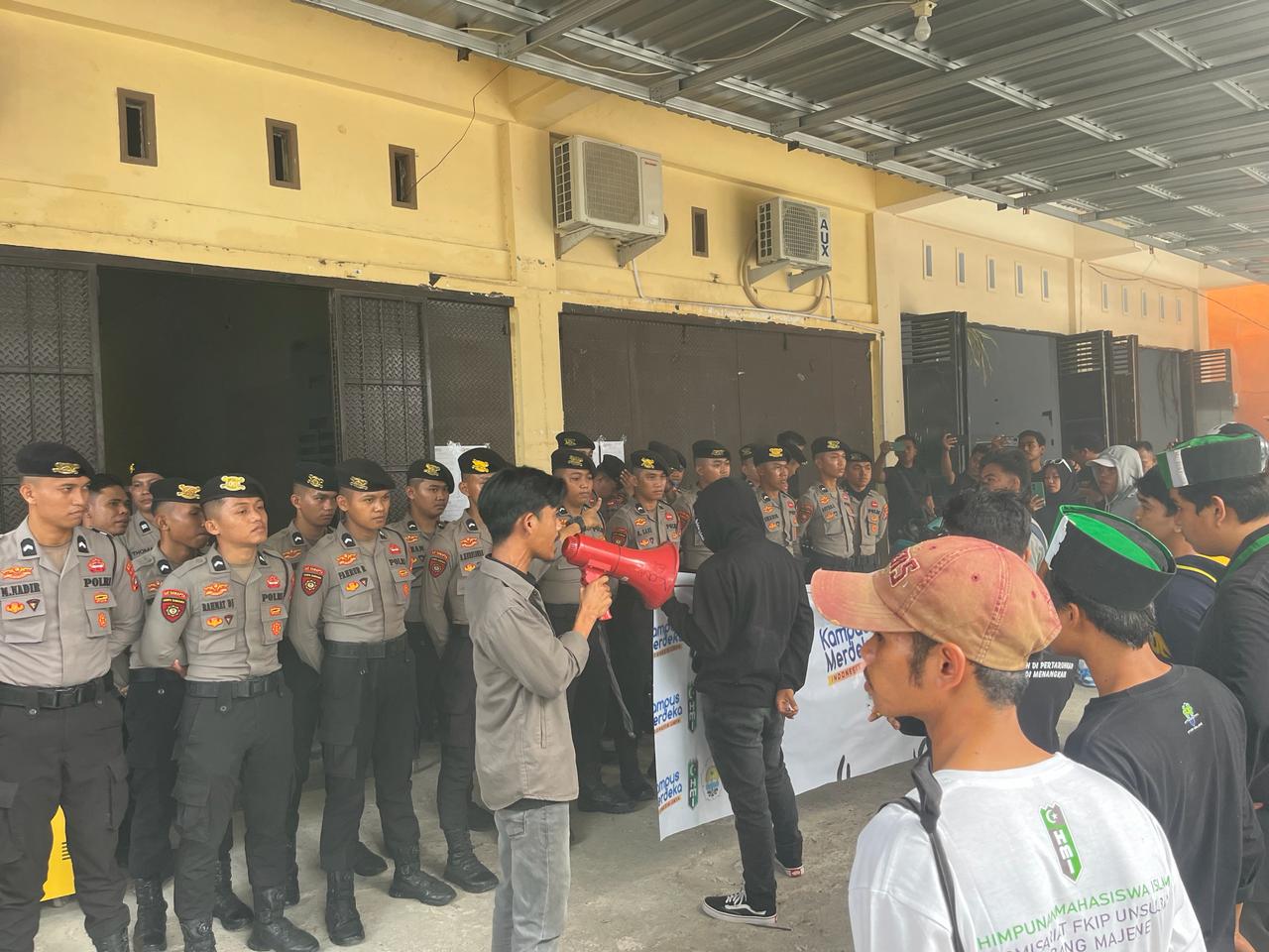 Terlihat Personel Polres Majene berjaga di sekitar area demonstrasi guna memastikan situasi tetap terkendali.