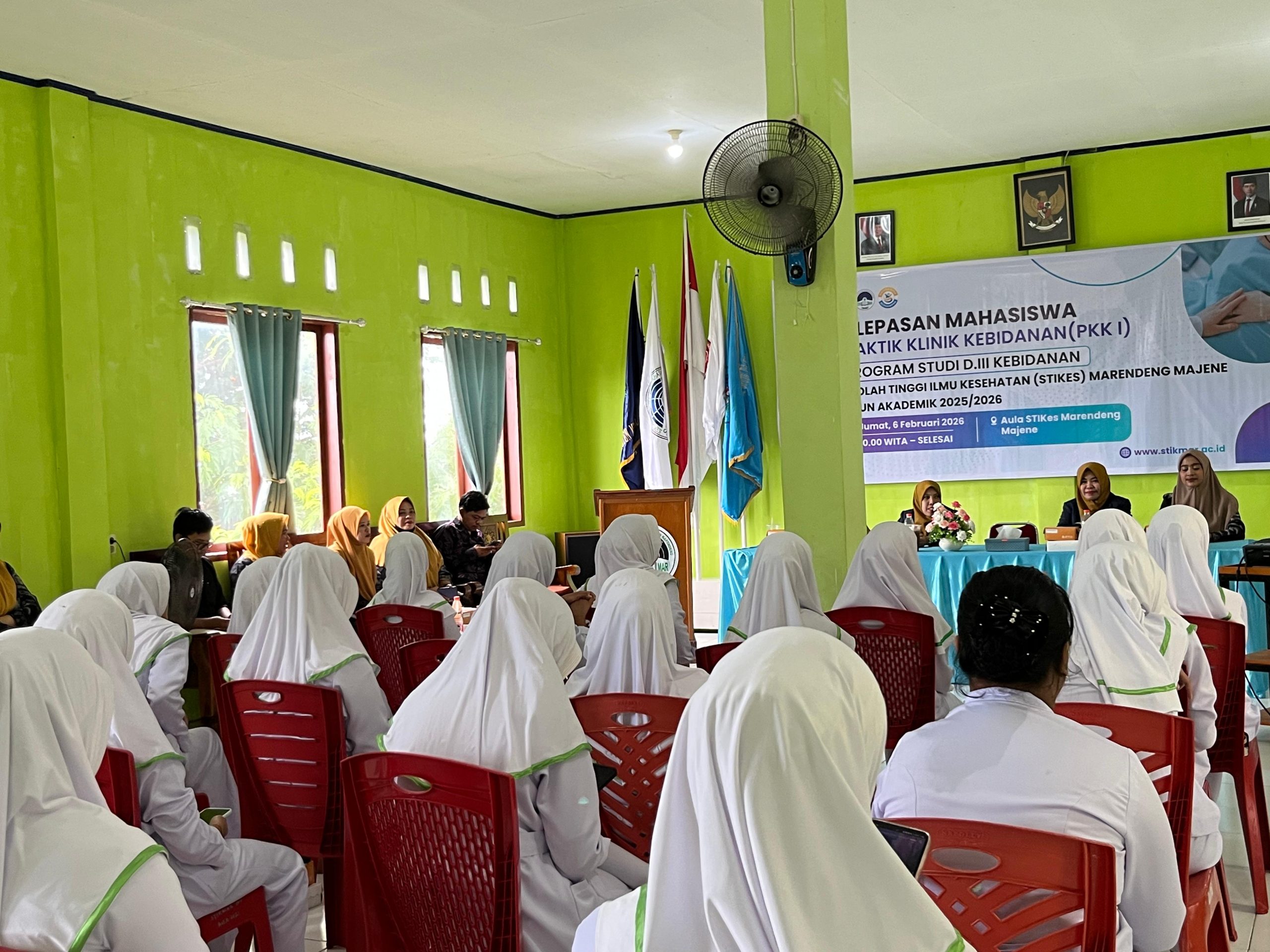 MAJENE,TERASSULBAR.id — Sekolah Tinggi Ilmu Kesehatan (STIKES) Marendeng Majene resmi melepas mahasiswa untuk mengikuti Praktik Klinik Kebidanan I yang akan berlangsung di Puskesmas Sendana II dan Puskesmas Malunda. Kegiatan pelepasan digelar di Aula STIKES Marende Majene, Jumat, 6 Februari 2026.
